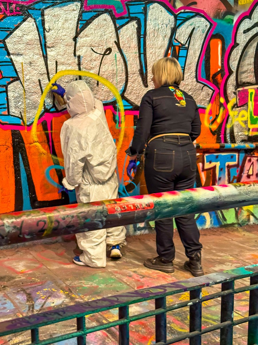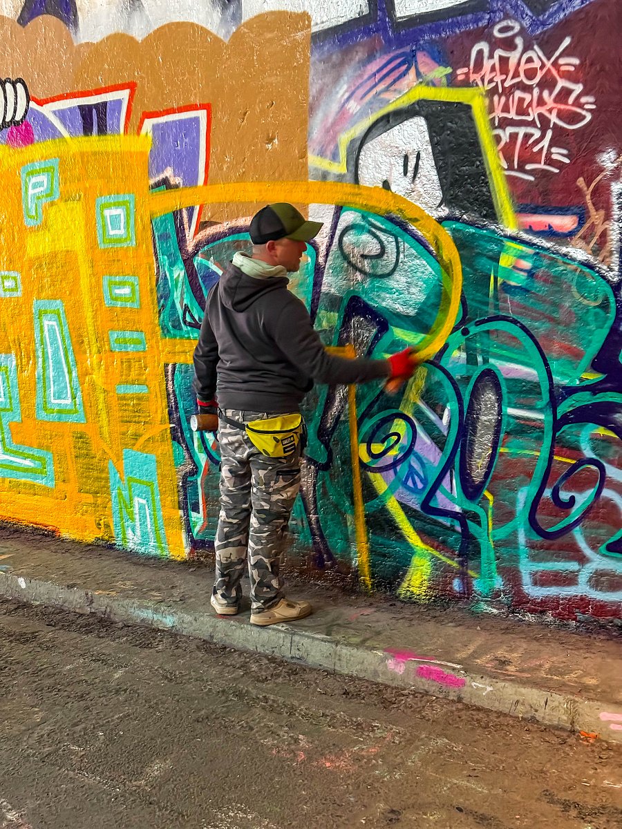 Dotterns pojkvän får i alla fall måla sin piece till slut och vi donerar färgen som blir över till några andra målare på platsen. Även dottern deltar med stor fröjd och jag lånar såklart en burk och drar min gamla tag på ett hemligt ställe.
