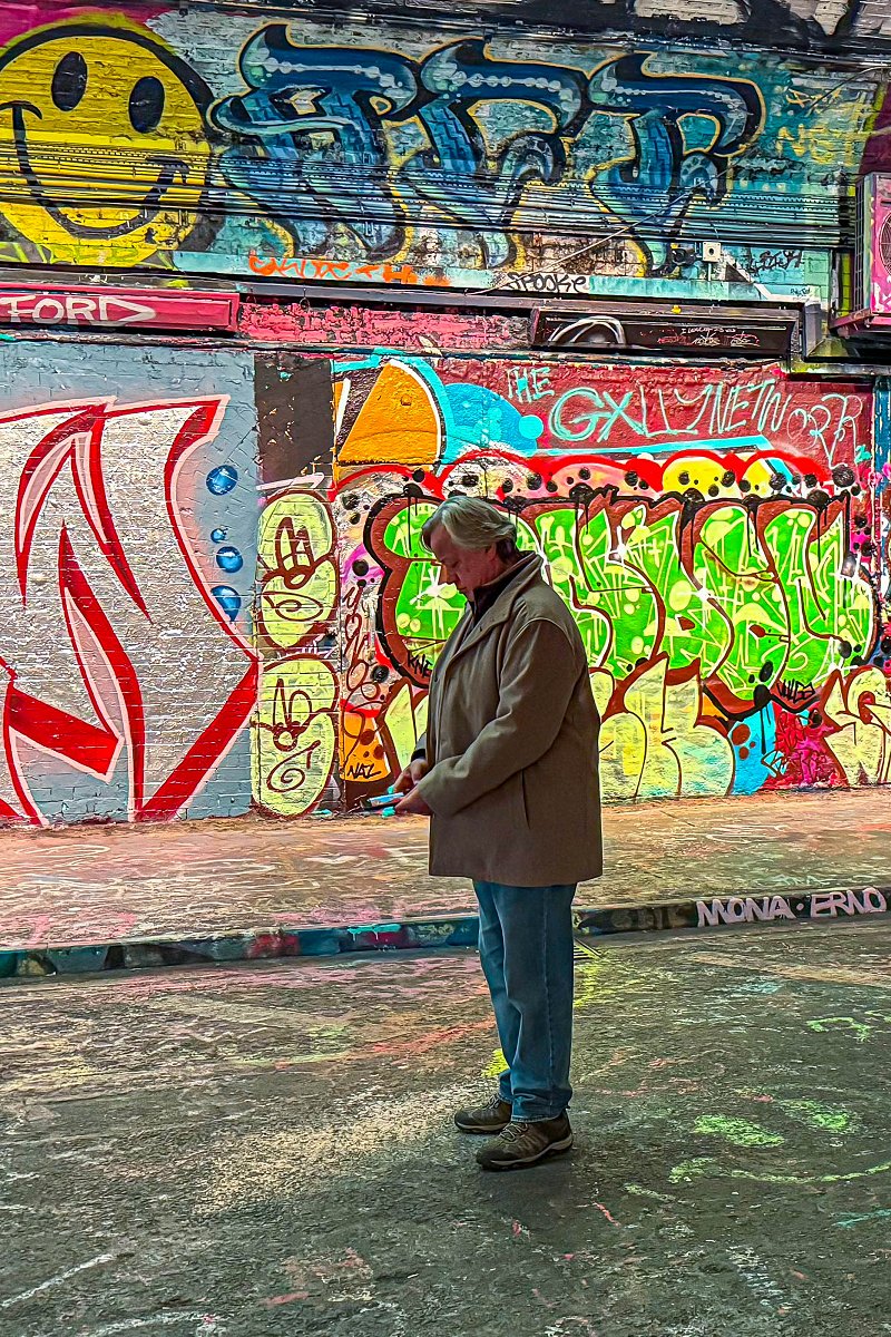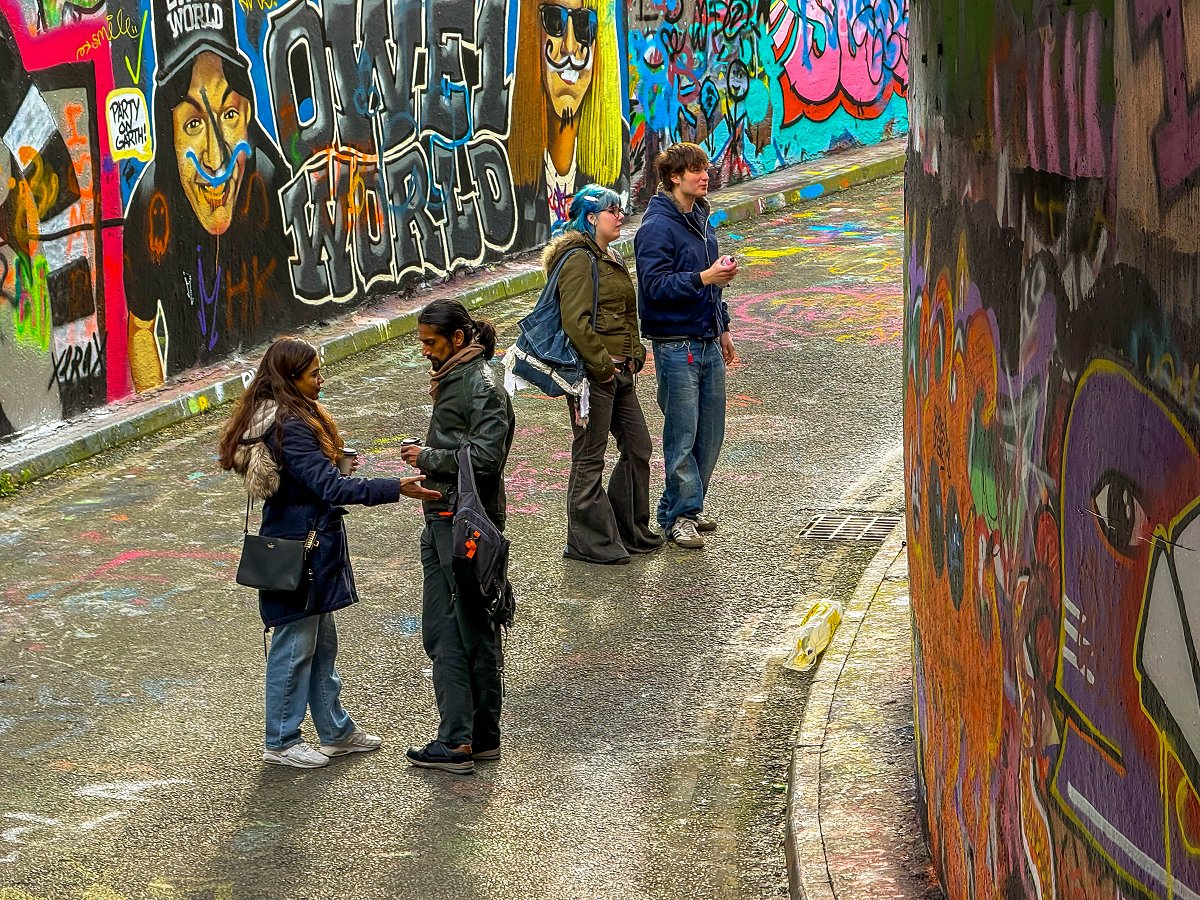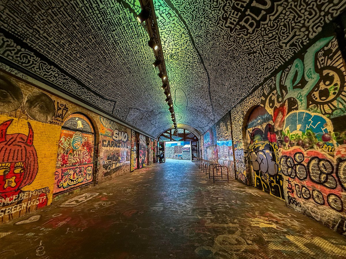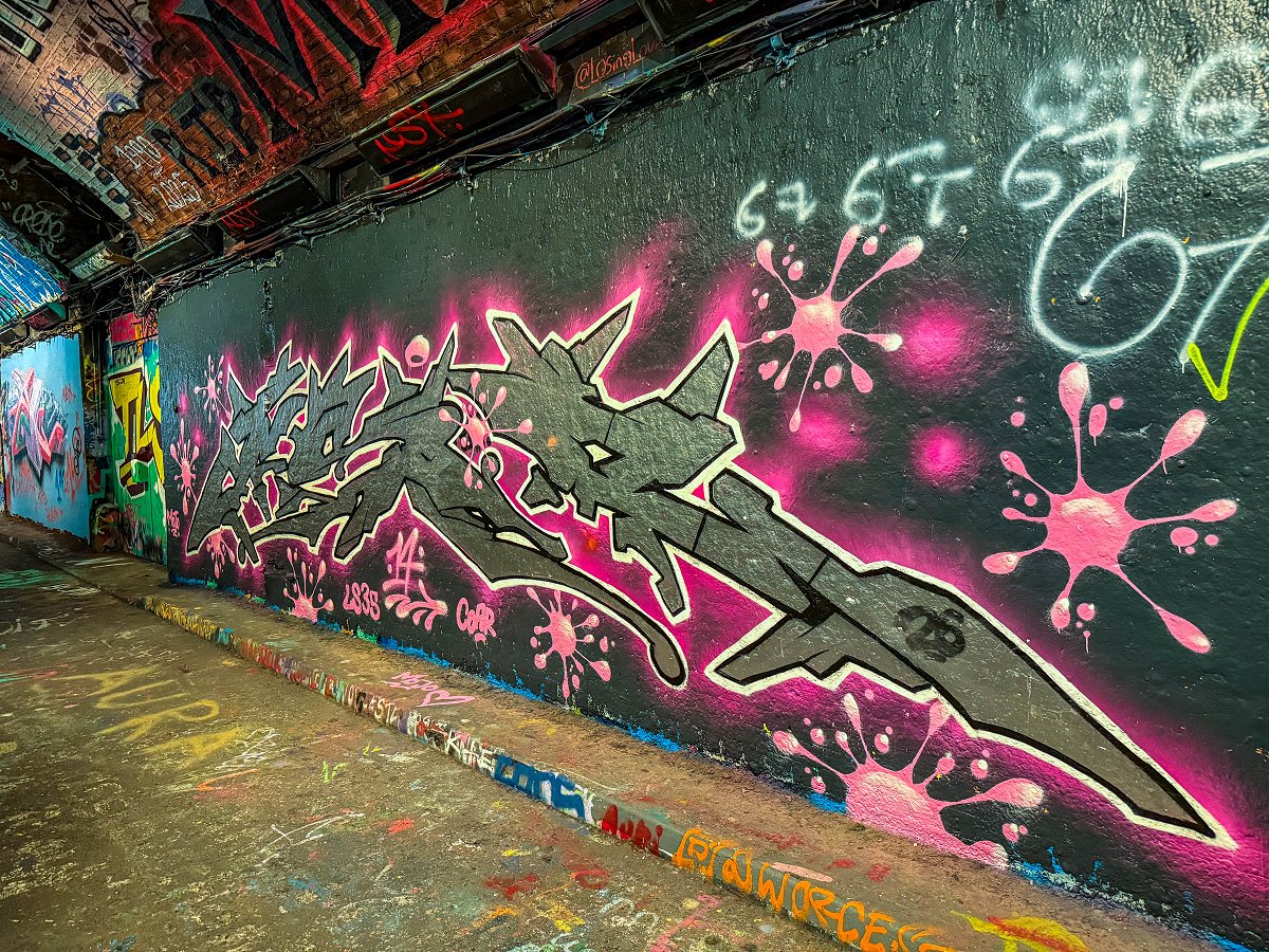 Jag tar tunnelbanan ner till Waterloo och tar mig därifrån gåendes ner till Leake St Graffiti Tunnel. Tunneln är både hög, bred och lång. Det är redan mycket turister på plats. Det är alltså lagligt att måla graffiti här och jag passerar minst 7–8 personer som är i färd med att måla. Detta är en av de coolaste platser jag har besökt.