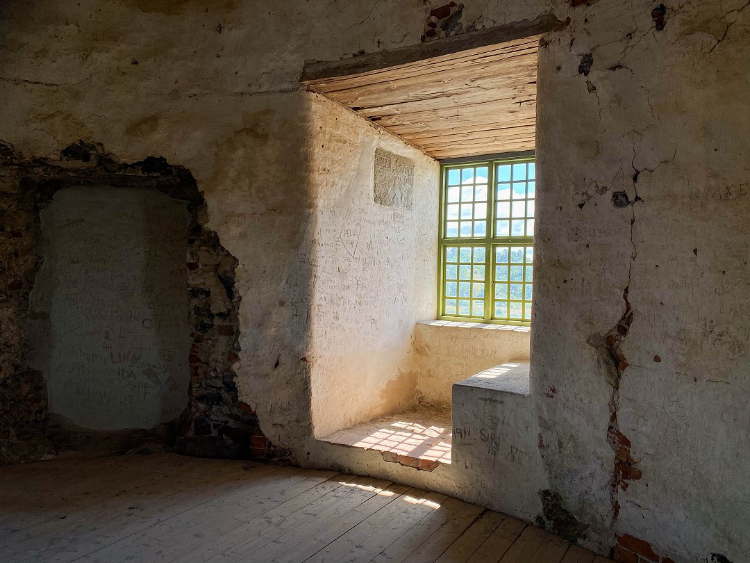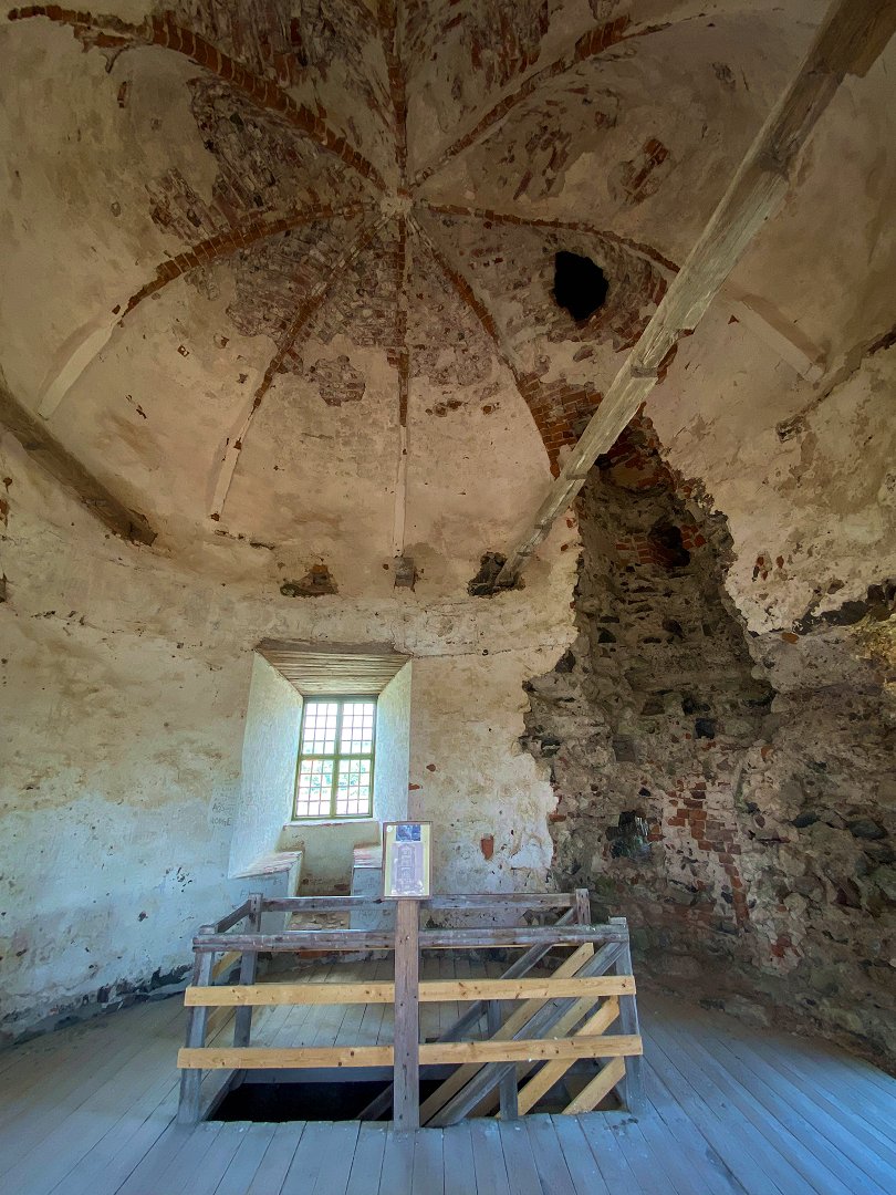 Jag betalar inträdet, köper en glass samtidigt och går upp till ruinen. Det första som slår mig när jag kommer in i ruinen är att insidan är i dåligt skick. Det ligger trasiga tegelstenar med flisor runtom på marken inne i många av ruinens rum och celler. Kan man inte städa upp lite och kanske sätta dit lite nya tegelstenar för att stadga upp och snygga till? Alla pengar kanske tog slut när en del av yttermuren rasade 2014.