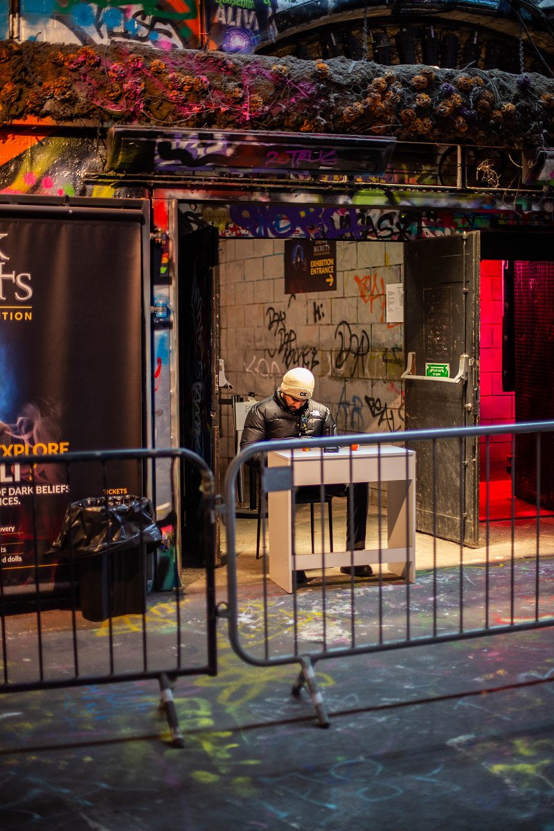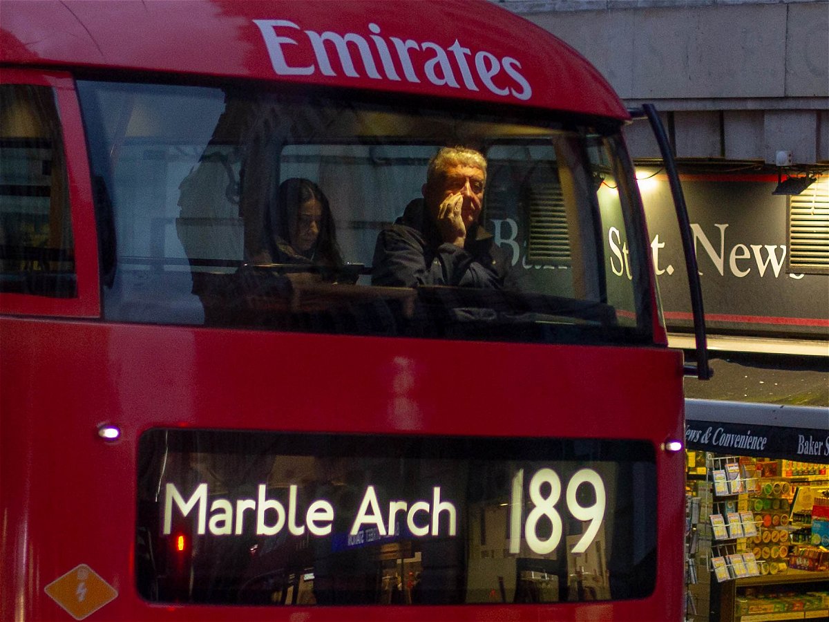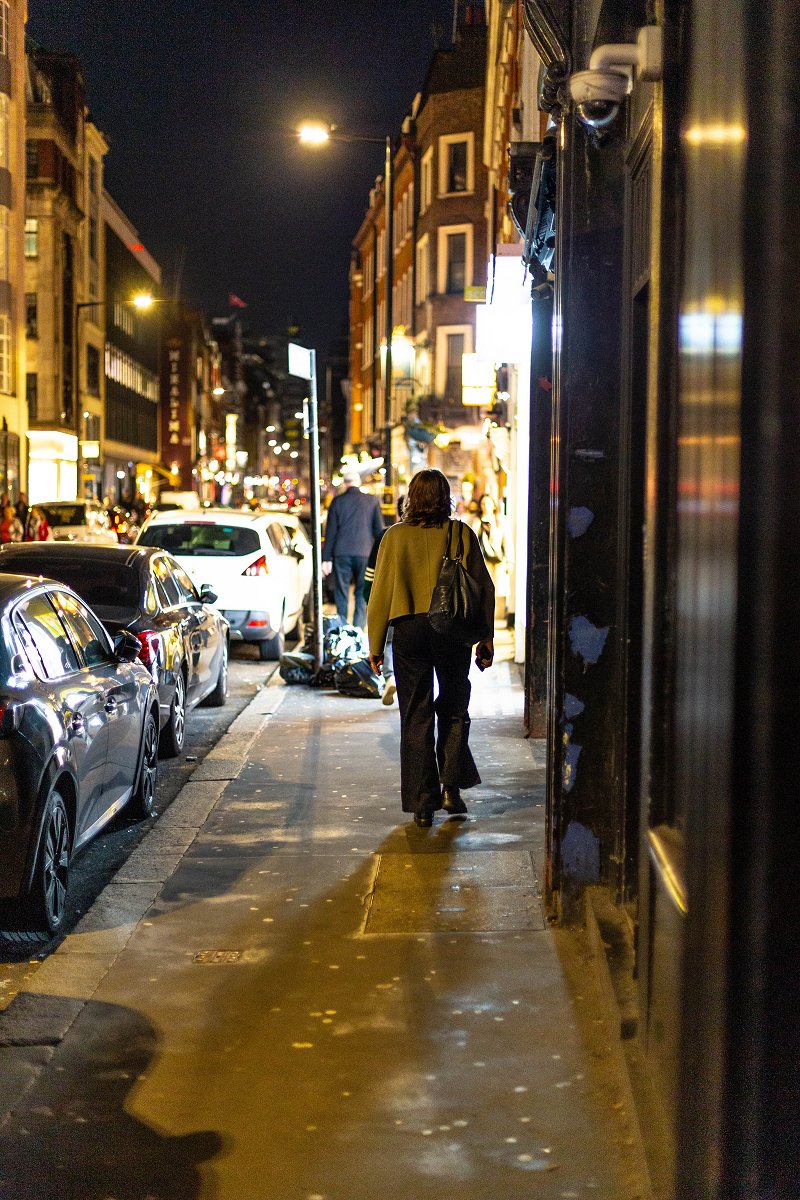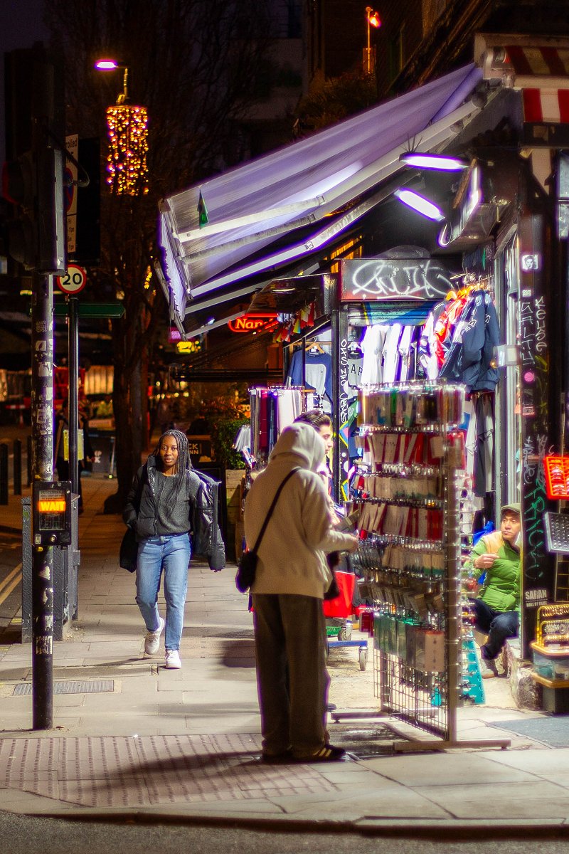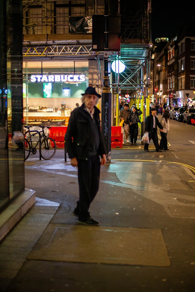 Första kvällen är vi i Soho och jag bygger sakta upp modet genom att fota ”ryggar”. Jag får en bra bild på tjej på en trottoar med kontrasterande ljus runtomkring. Strax senare passerar jag en äldre man med hatt. Jag vänder mig om för att ta kortet och precis då vänder sig mannen om och tittar rakt på mig. Han har såklart sett min kamera och listade ut att jag skulle fota honom. Han står stilla och jag tar korten och håller upp tummen som tack. Men ack och ve, kortet är suddigt!