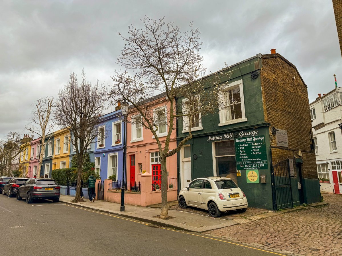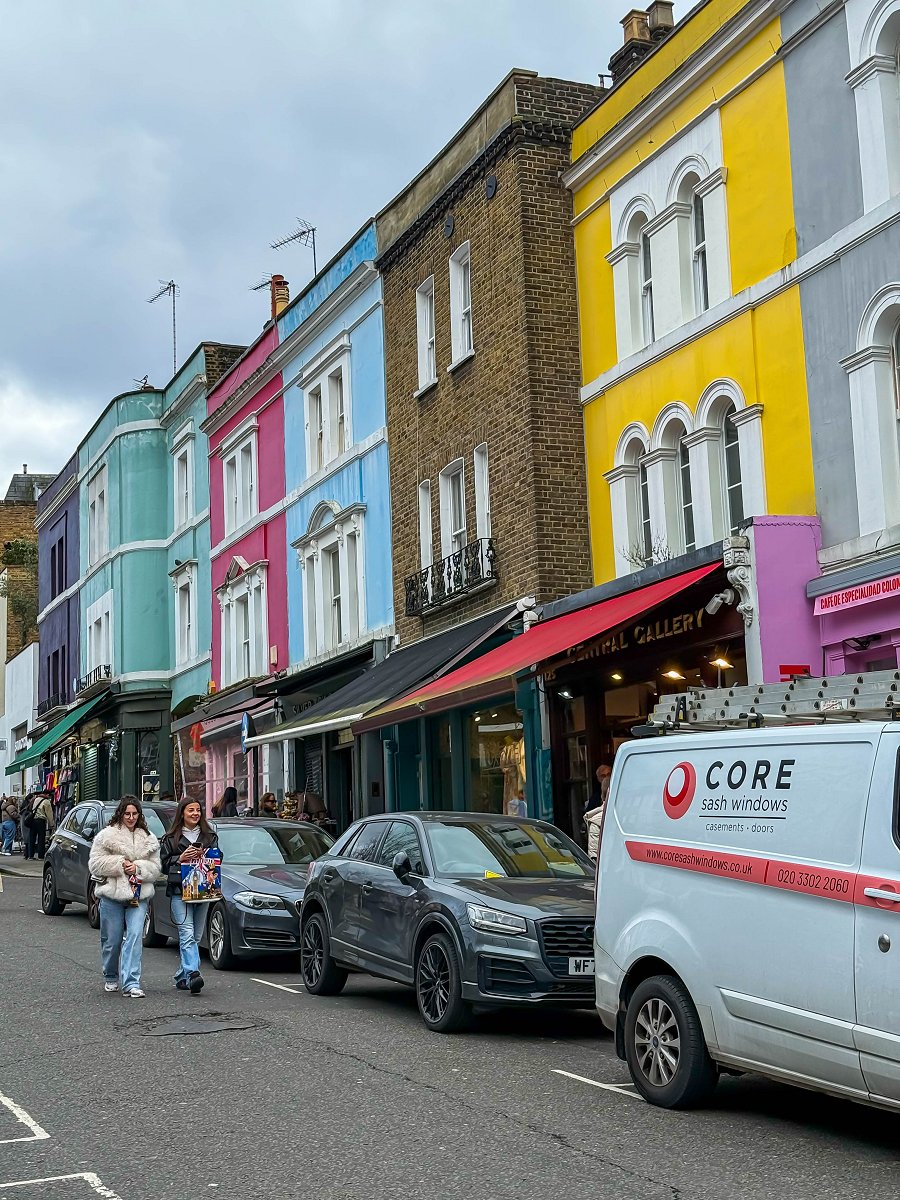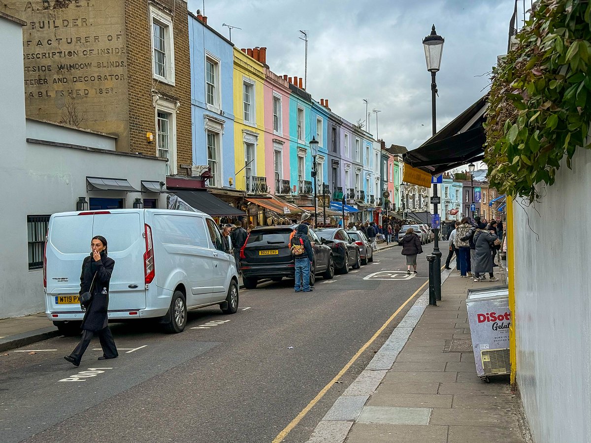 Vi tar tunnelbanan till stationen Notting Hill Gate som ligger i närheten av Notting Hill. Vi lyckas dock med konststycket att gå rakt in i ett bostadsområde där vi till slut efter 10 minuters promenad återvänder till platsen där vi började. Vi rättar till vårt misstag och följer sedan gatan Portobello Road hela vägen genom Notting Hill. Gatan är känd för sina vintage och second hand butiker. Ungdomarna shoppar och jag fotar. Vi passerar såklart bokaffären som är med i filmen Notting Hill. En mindre folkmassa huserar utanför affären och fotar varandra och sig själva.