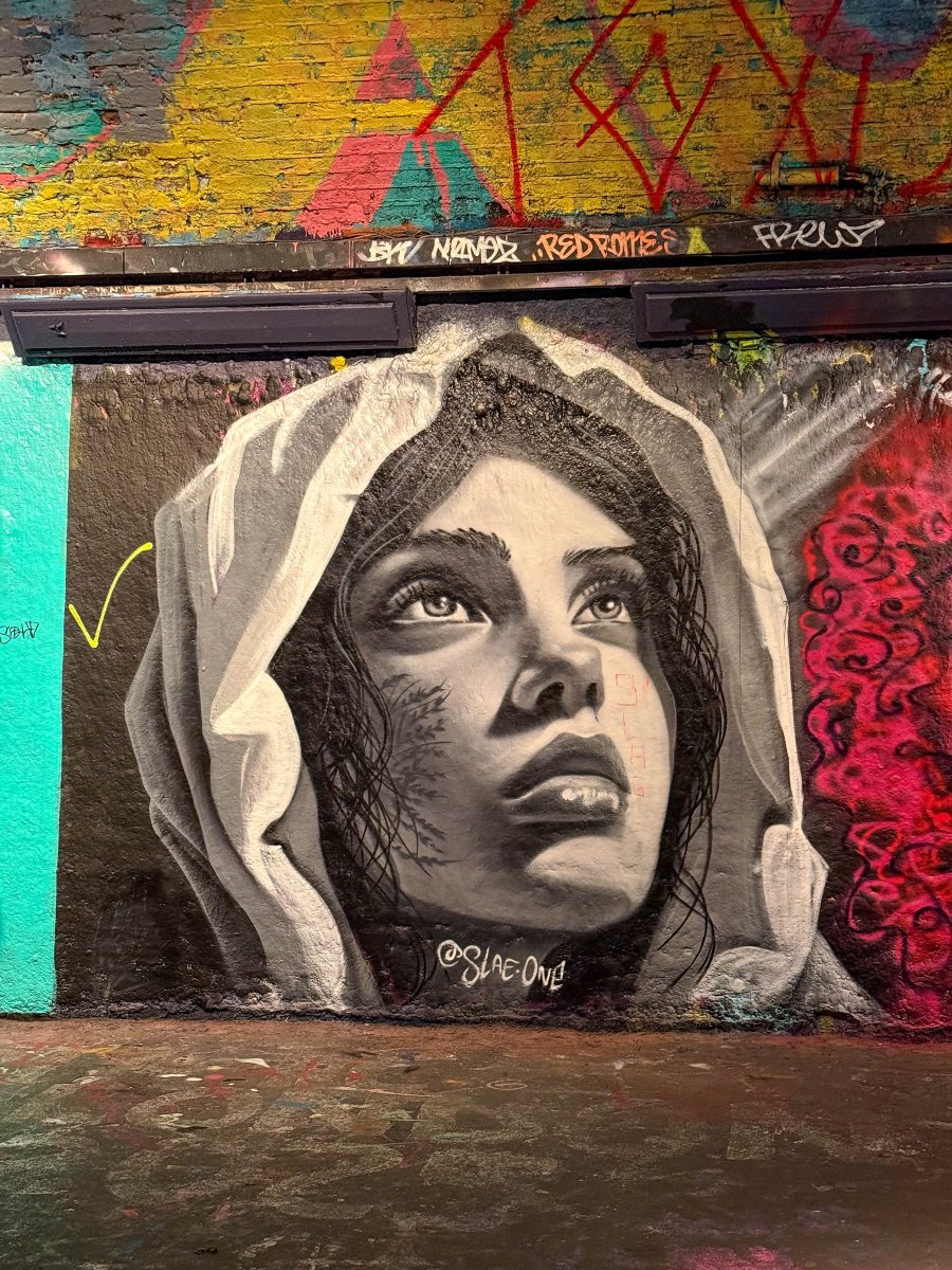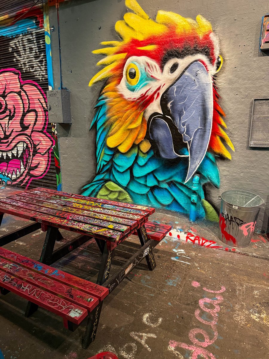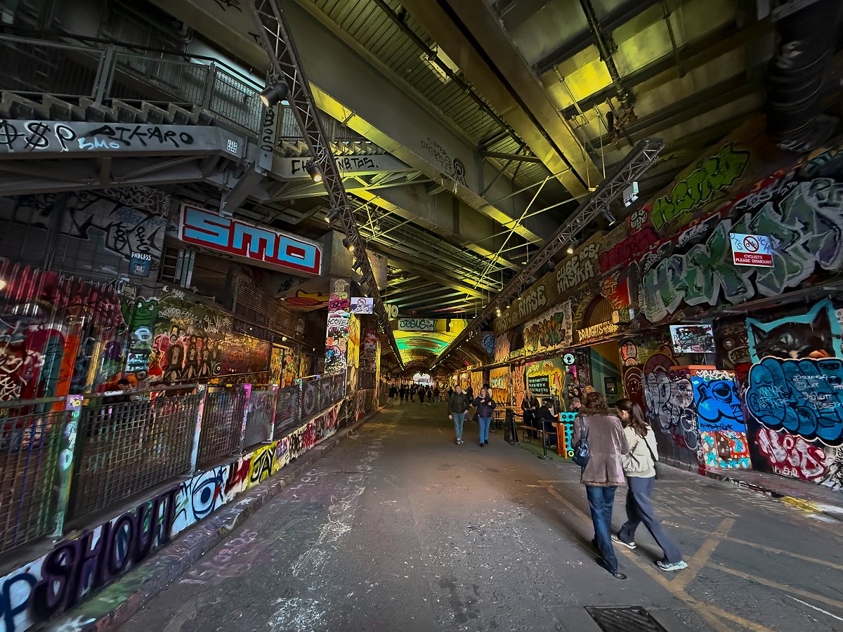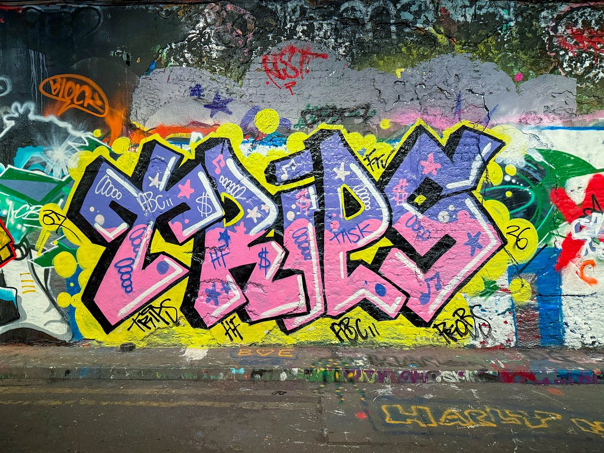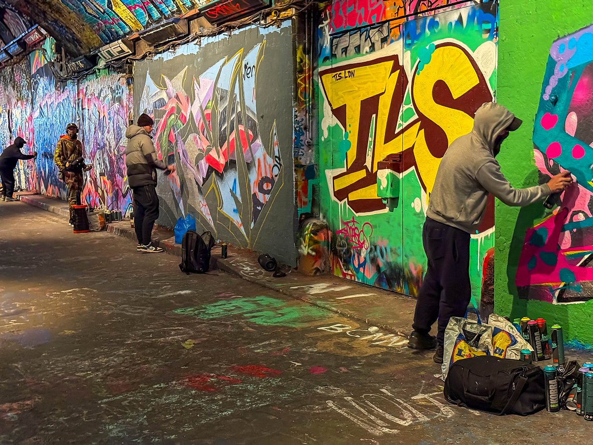 Jag tar tunnelbanan ner till Waterloo och tar mig därifrån gåendes ner till Leake St Graffiti Tunnel. Tunneln är både hög, bred och lång. Det är redan mycket turister på plats. Det är alltså lagligt att måla graffiti här och jag passerar minst 7–8 personer som är i färd med att måla. Detta är en av de coolaste platser jag har besökt.