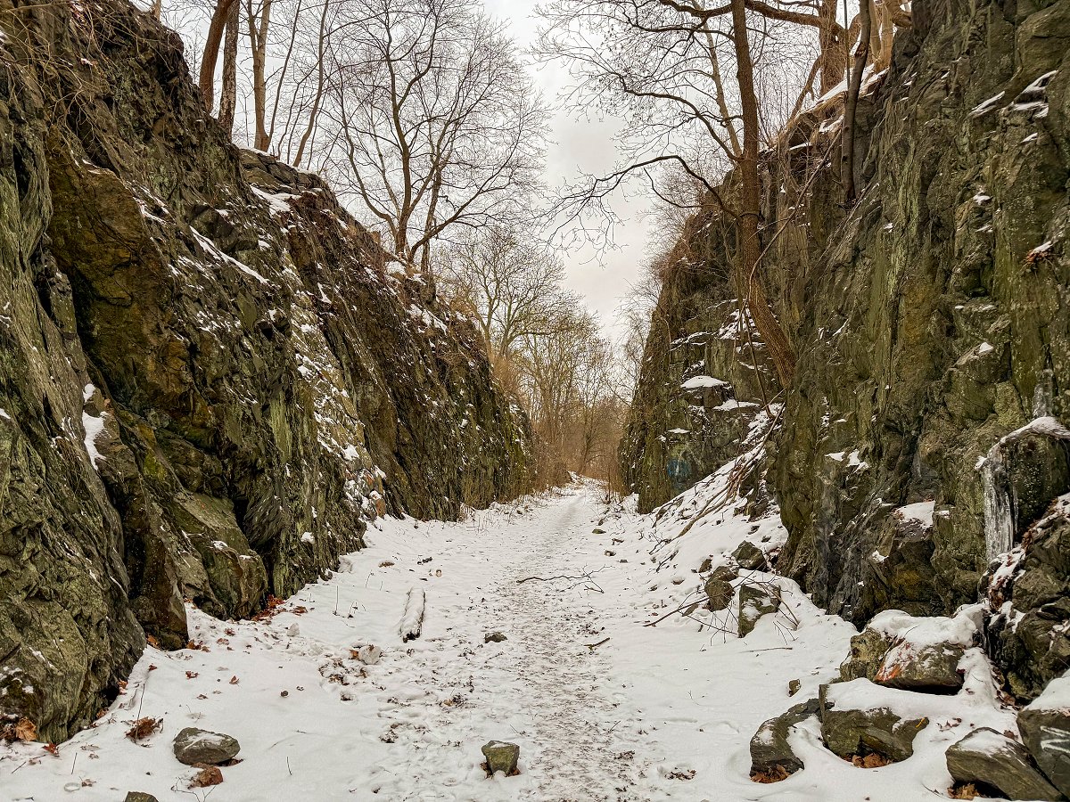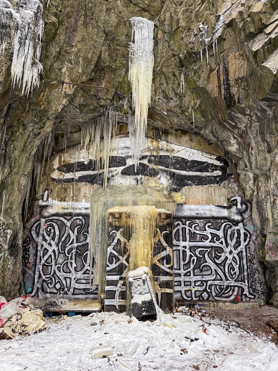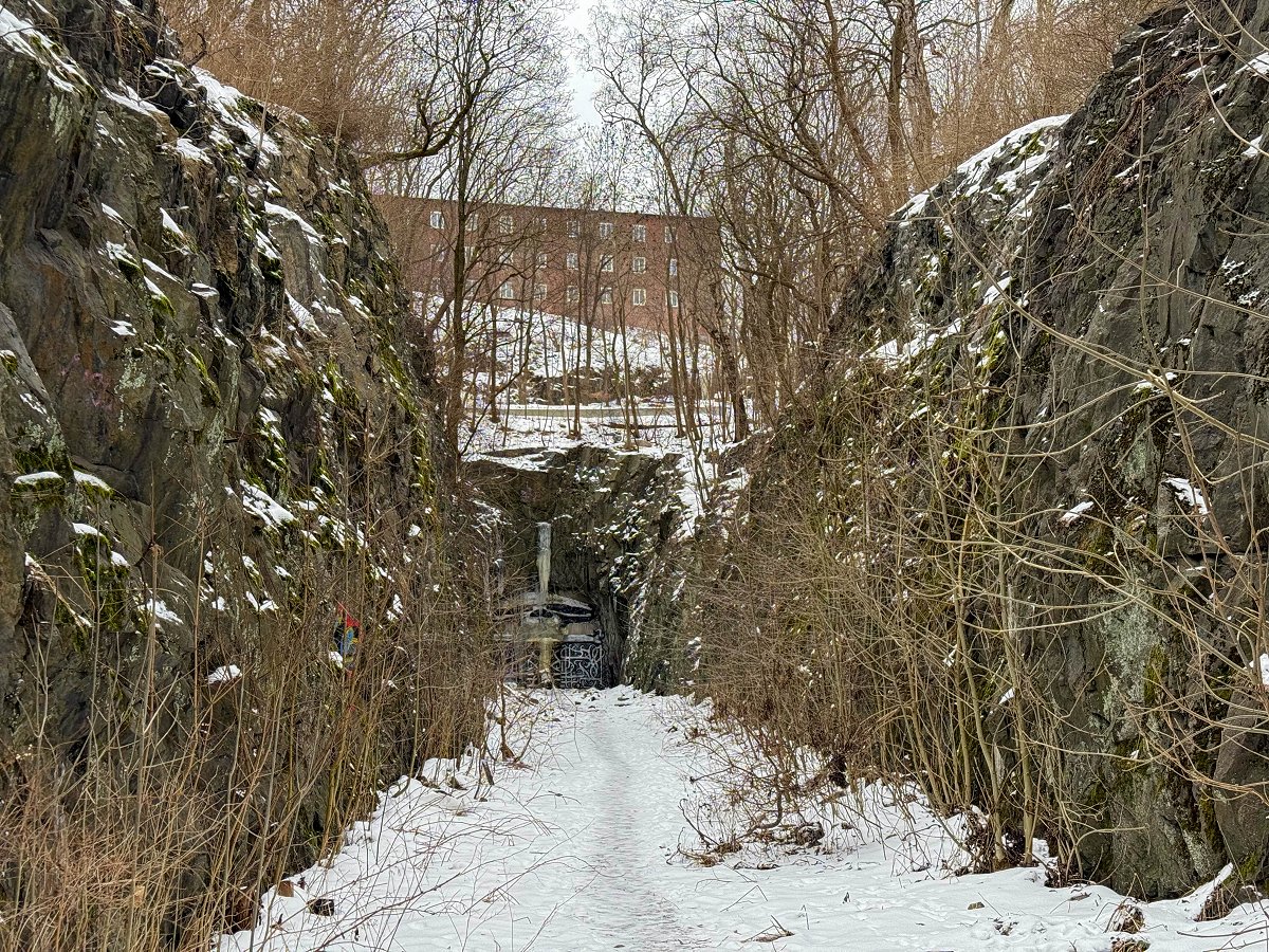 Min plan var att återvända till tunneln en kväll efter jobbet. Men vid närmare eftertanke kom jag fram till att det vore bättre att åka dit under dagen då det är ljust. Jag går dit en råkall onsdag på lunchen. Det visar sig vara lätt att komma åt tunneln. Det finns inga avspärrningar, inga förbudsskyltar och tunneln är vidöppen i båda ändar. Exemplariskt helt enkelt. Det är egentligen två tunnlar men den ena tunneln är stängd med en stor port som någon målat på så att den ser ut som nergången till Hades.